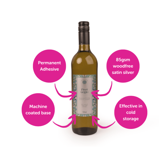 - 85gsm woodfree, machine coated base with satin silver ‘metallic’ coating