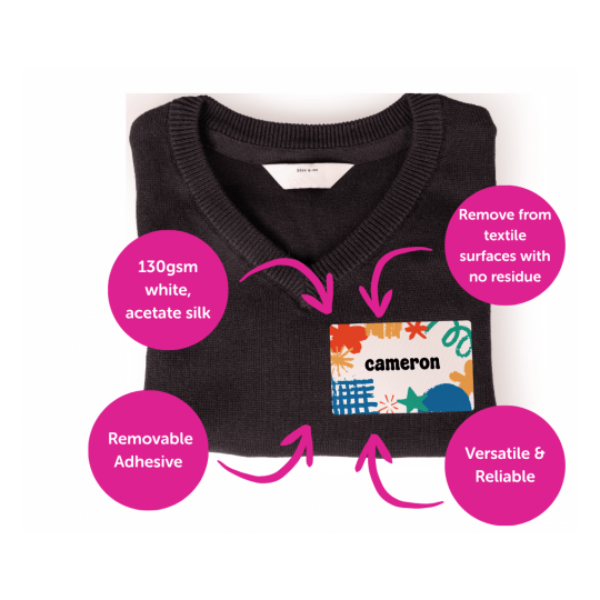 - Can be used where flexible substrates require labelling (mattresses, clothing, textiles, sports bibs); as a decorative label or a simple name badge.